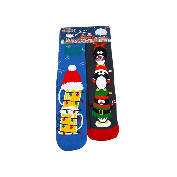 Γυναικείες Βαμβακερές Χριστουγεννιάτικες Κάλτσες Σετ 2 Ζευγάρια Μακριές Πιγκουίνοι Και Χριστουγεννιάτικη Μπύρα