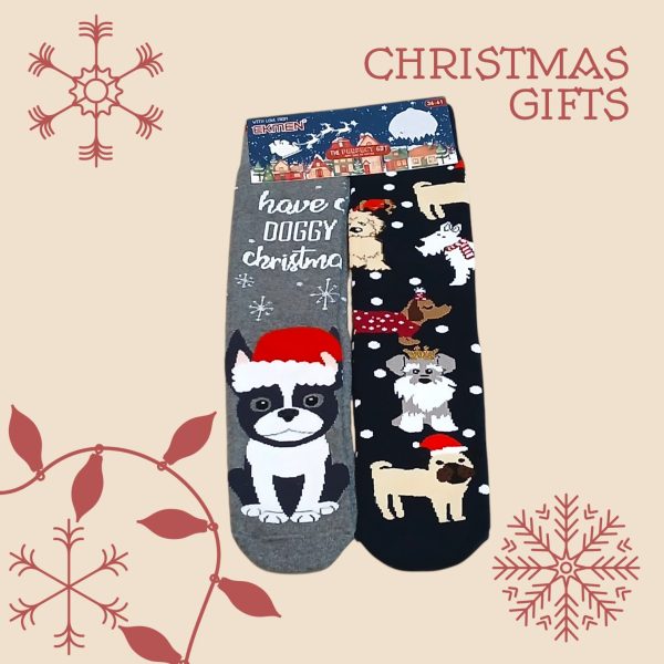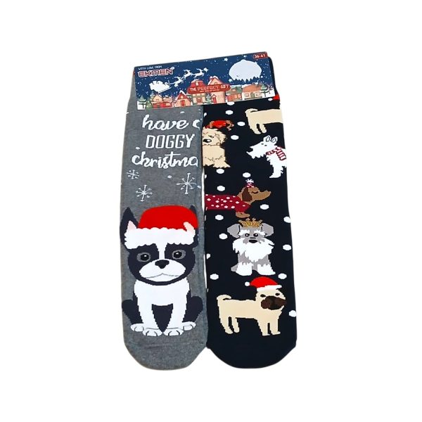 Γυναικείες Βαμβακερές Χριστουγεννιάτικες Κάλτσες Σετ 2 Ζευγάρια Μακριές Σκυλάκια σε Μαύρο και Ανθρακί