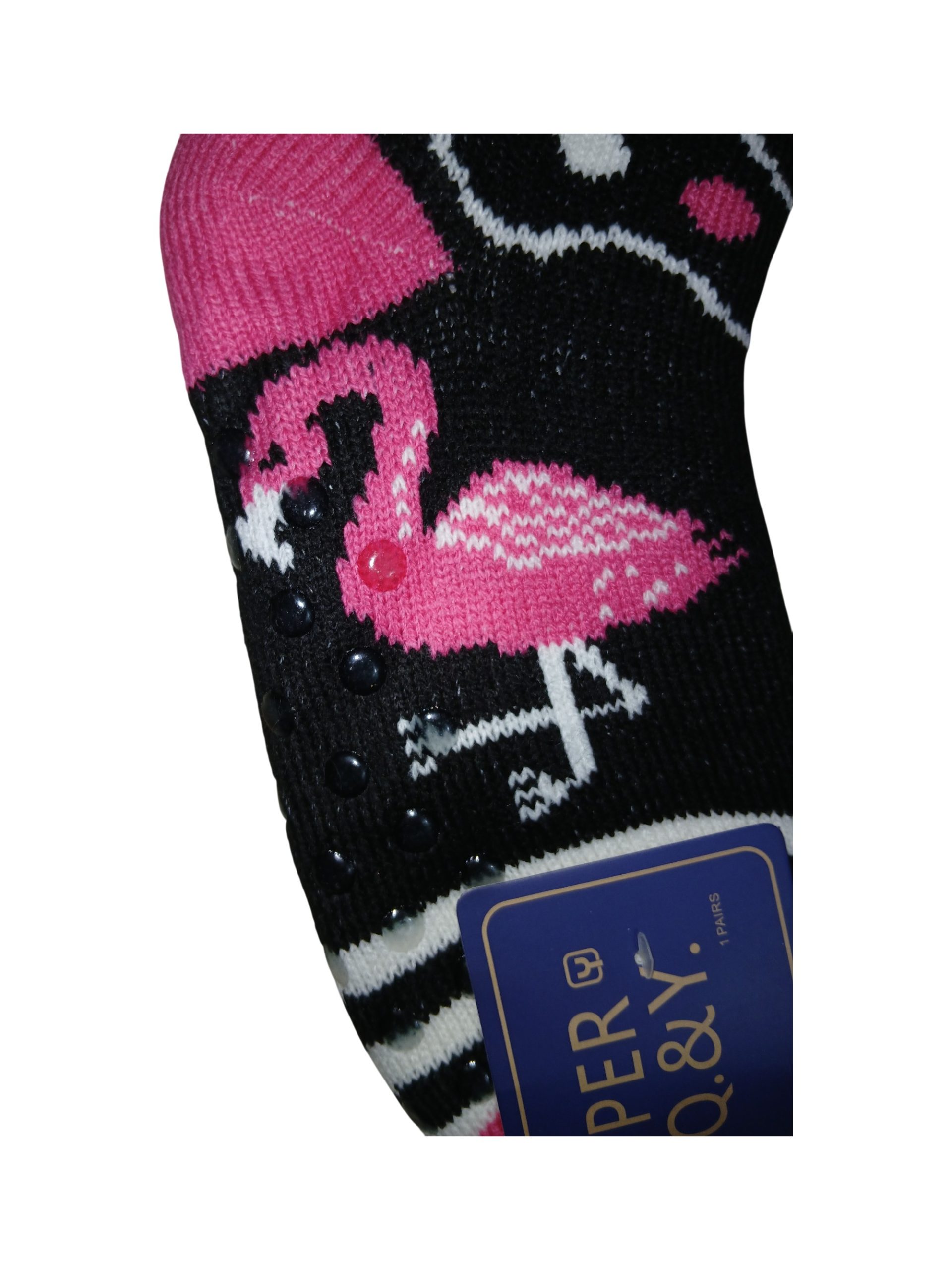 Γυναικεία καλτσοπαντόφλα με εσωτερική χνουδωτή επενδυση σε μαύρο χρωμα και σχέδιο ροζ φλαμίνγκο .