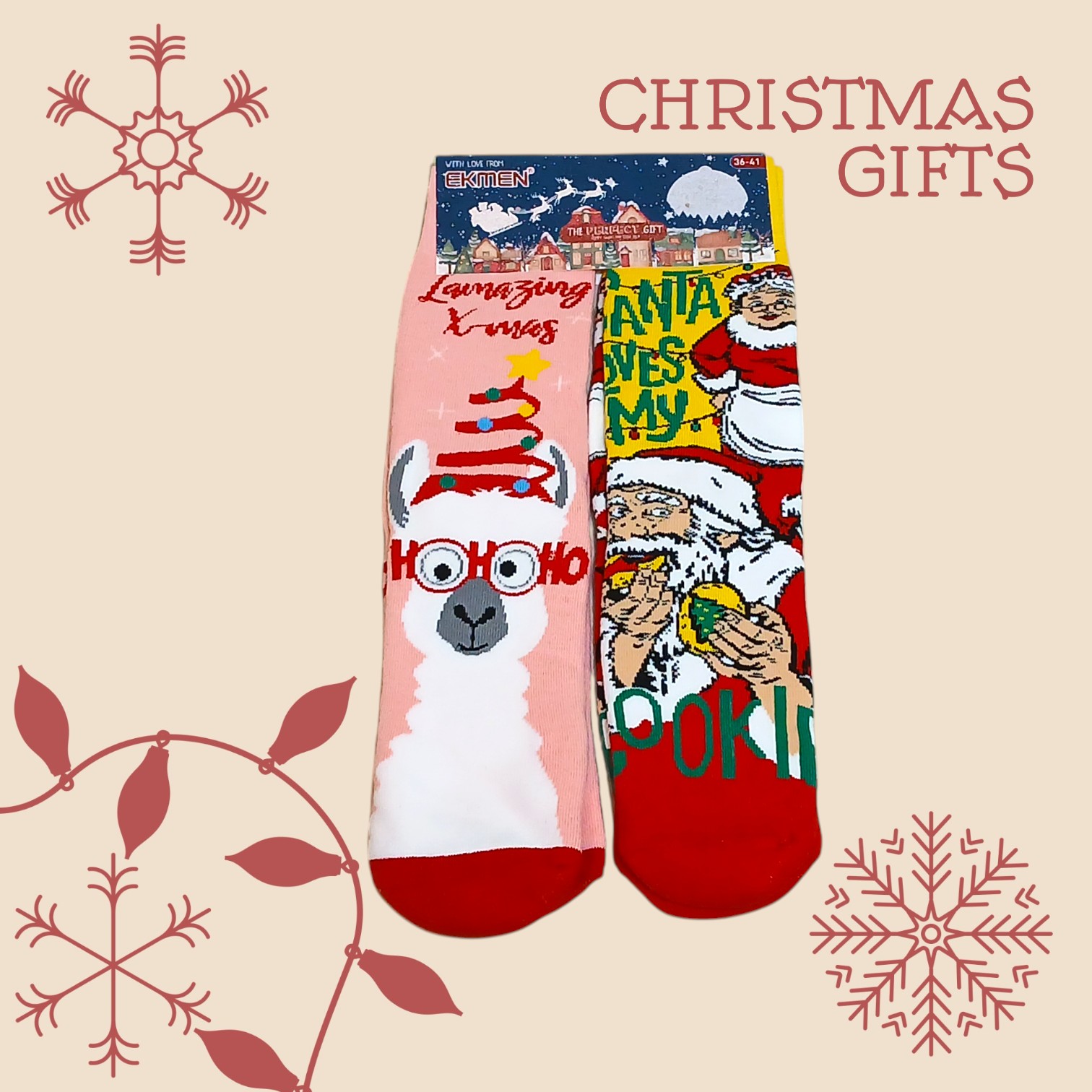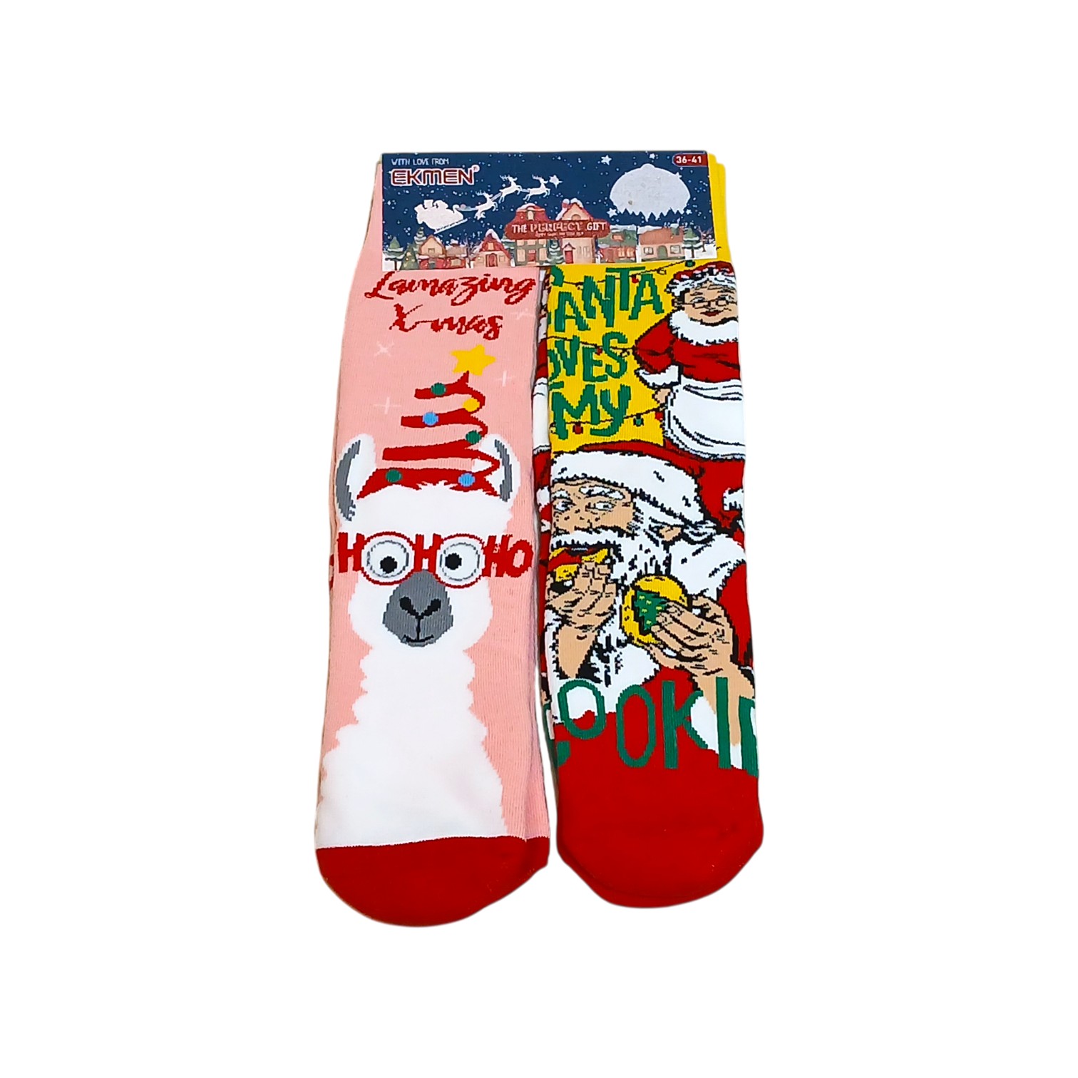 Γυναικείες Βαμβακερές Χριστουγεννιάτικες Κάλτσες Σετ 2 Ζευγάρια Μακριές ‘Αγιος Βασίλης Και Χριστουγεννιατικο Λάμα